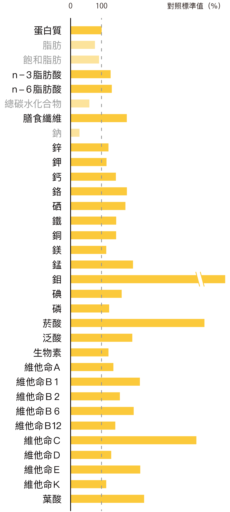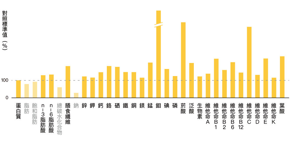 *其標準是根據日本農林水產省制定的營養素等標準值(18 歲以上,標準熱值2200 大卡),1 天標準值的1/3 設為100時。