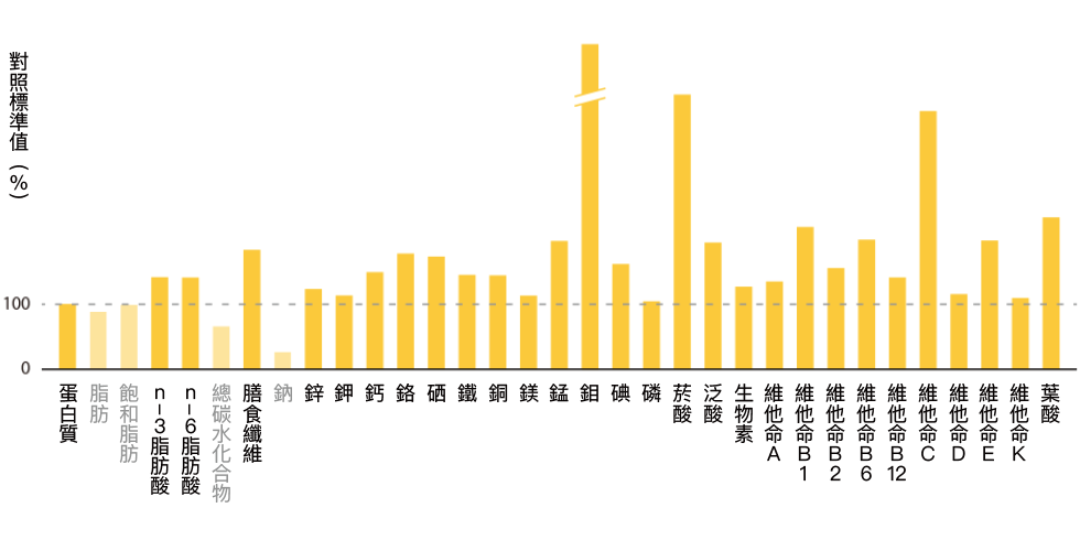 *其標準是根據日本農林水產省制定的營養素等標準值(18 歲以上,標準熱值2200 大卡),1 天標準值的1/3 設為100時。