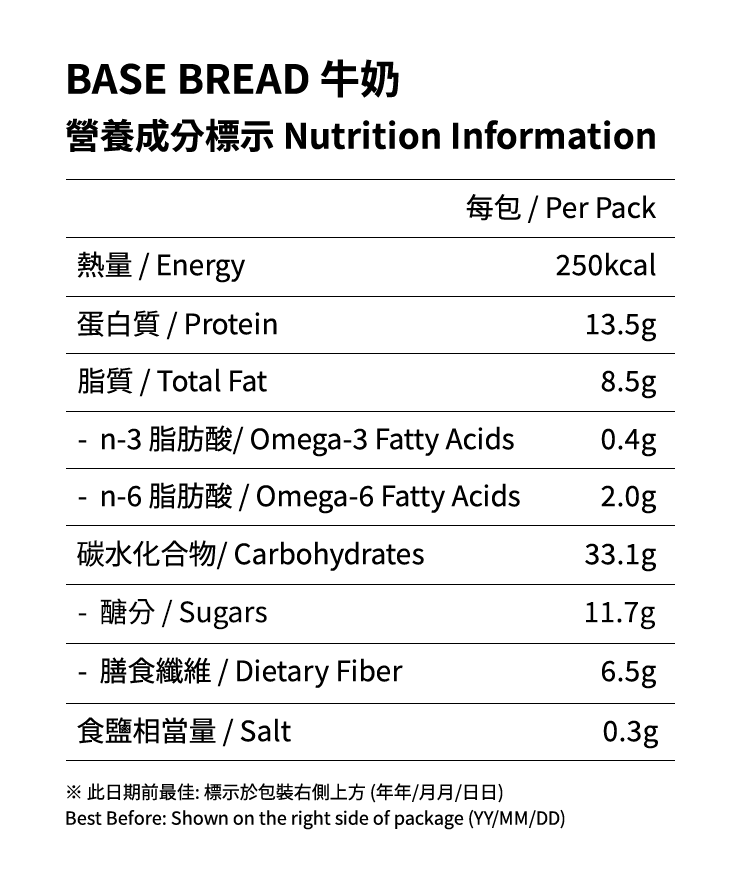 小麥全麥粉(日本製造)、牛奶風味醬、小麥蛋白、大豆粉、水飴、粗糖、加工油脂食品、麵包酵母、米糠粉、奇亞籽、乳蛋白、釀造醋、牛奶鈣、昆布粉末、粉末油脂、蛋黃粉末/增稠劑(加工澱粉、增稠多醣類)、調味料(無機鹽等)、酸味劑、乳化劑、香料、甜味劑(醋磺內酯鉀、蔗糖素)、(部分含有小麥、雞蛋、乳製品、大豆)